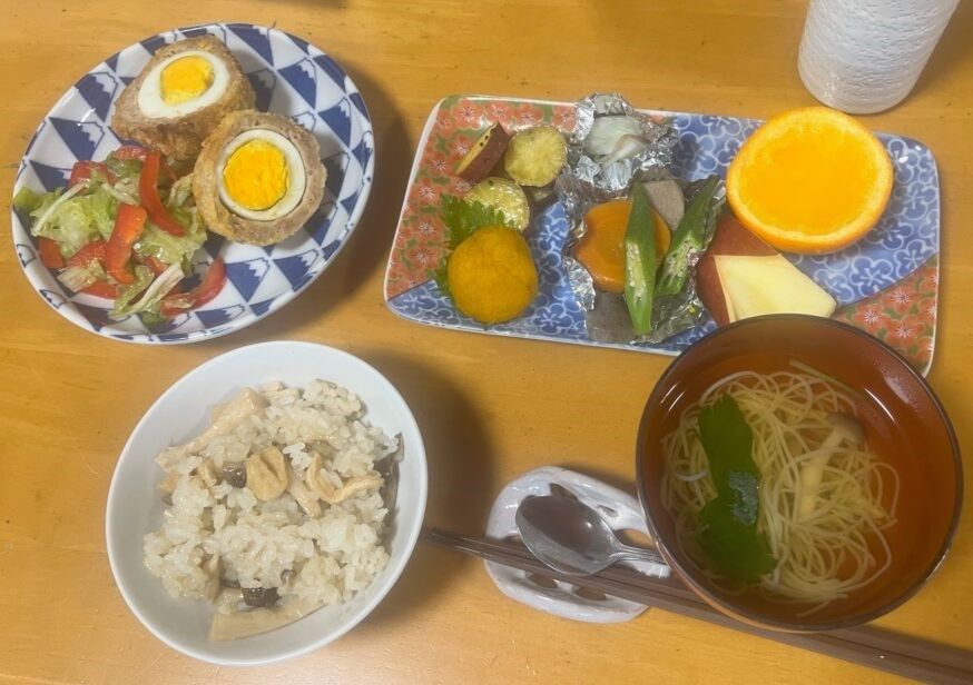 見た目も美しく月に模したスコッチエッグや丸く形成したカボチャやサツマイモのおかず、彩りを添えるサラダ、丸いニンジンが入った煮物、光り輝く月のようなオレンジのゼリーやりんごのうさぎが華やかさを演出し、思わす顔もほころびます。